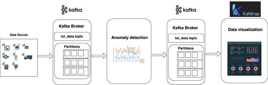 Let’s do a brief overview of the steps involved in this process. As shown in the picture above , the data source is going to be ingested into a Kafka topic . The anomaly detection model will consume the records from this Kafka topic and identify anomalies. The anomalies will then be sent to a new topic. From this new topic, the data will be forwarded to a data visualization tool. In our case, we are using Kafdrop as our data visualization tool.