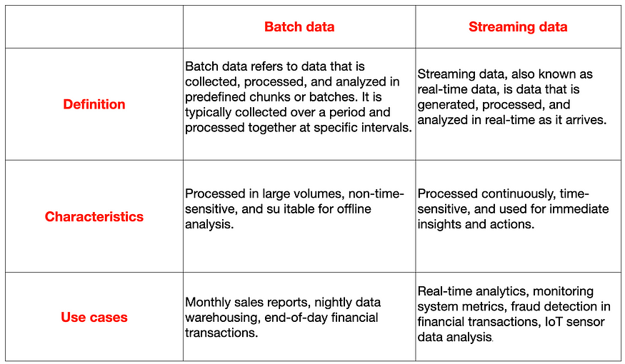 In data science projects, we encounter two types of data: batch (historical data) and real-time data (streaming data). To make it easy to grasp, let’s highlight the key differences in a table format: