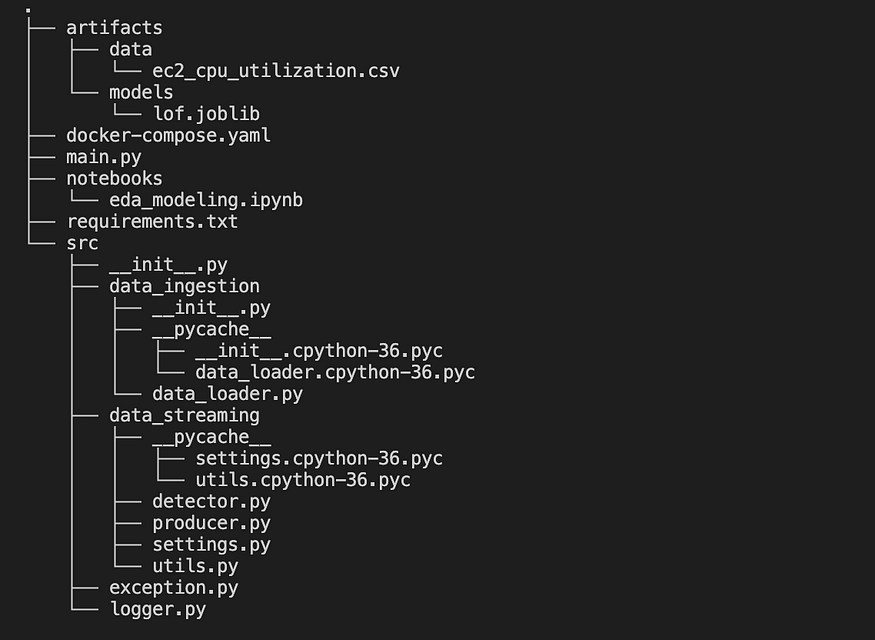 The “src” directory is structured into two subfolders. The first, named “data_ingestion,” contains a versatile script in the form of a class for reading data from various sources. It’s currently configured to read from an Excel file. The second subfolder, “data_streaming,” includes three files: “producer” generates synthetic data mirroring the original dataset’s statistical patterns and feeds it to a Kafka topic. “detector” utilizes an anomaly detection model to consume Kafka topic data, identifying potential anomalies. The “settings” file stores essential variables such as topic names and Kafka broker details.