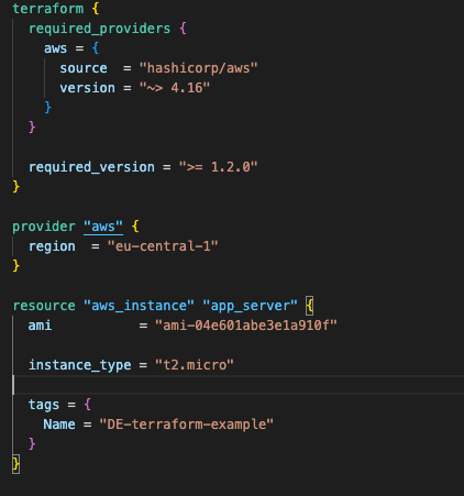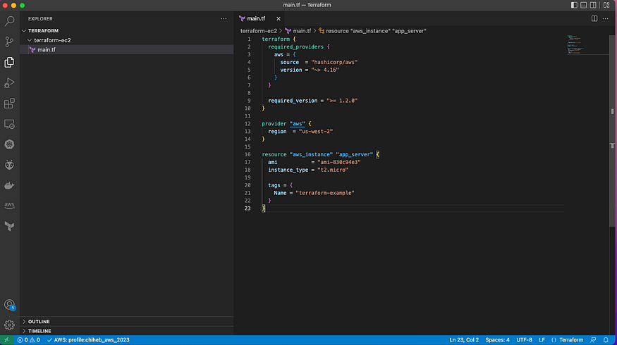 As you can see in the picture below , we’ll use the HashiCorp Configuration Language to write configuration files. Specifically, we’ll create a `main.tf` file in the “terraform-ec2” folder. This file will contain the configuration to define a single AWS EC2 instance.