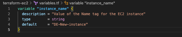 Before proceeding, let’s discuss Terraform variables. Up to now, we’ve hardcoded values in the resource section, but when dealing with multiple resources like RDS, VPC, ECS, and more, Terraform variables become essential. To implement this, we’ll create a file named ‘variables.tf’ in the same directory as ‘main.tf’.