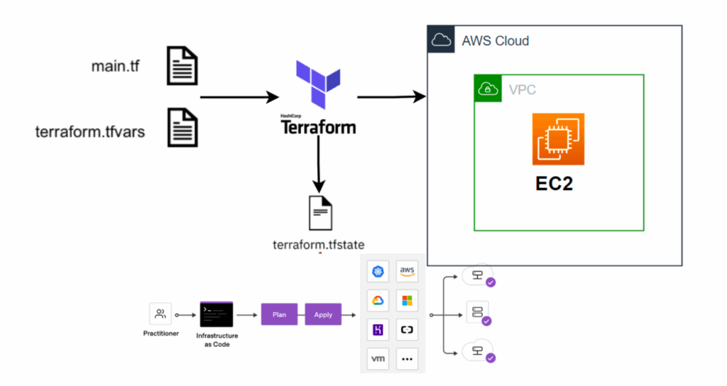 In this stage, we define the resources we want using Terraform configuration. For instance, we might specify the creation of an EC2 instance within an AWS VPC (Virtual Private Cloud). The configuration details are outlined in the Terraform files.