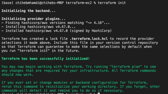 After writing the setup, run “terraform init” in the same folder as your setup file (main.tf). This command gets everything ready for your Terraform project, downloading needed tools and preparing a place to store its important data.